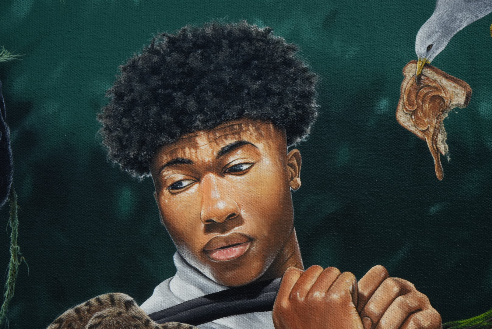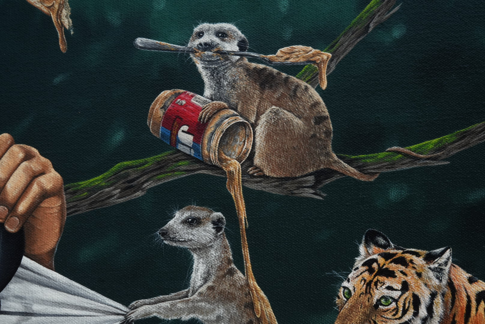 In a world suspended between memory and dream, A Feast for the Forgotten captures a surreal moment where wild creatures gather in playful rebellion, stealing fruit, sipping soda, and spreading peanut butter with human precision. Amid the chaos, a young man walks calmly through the scene, pulling his shirt against the tug of a meerkat, as if tethered between worlds.
