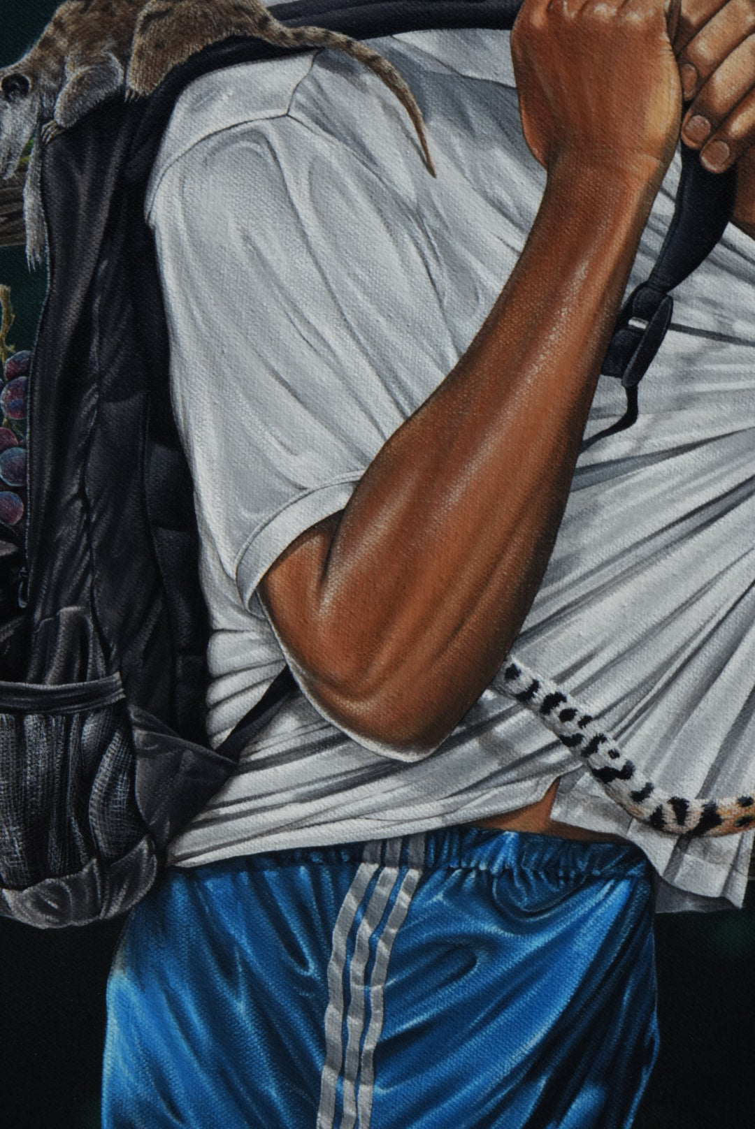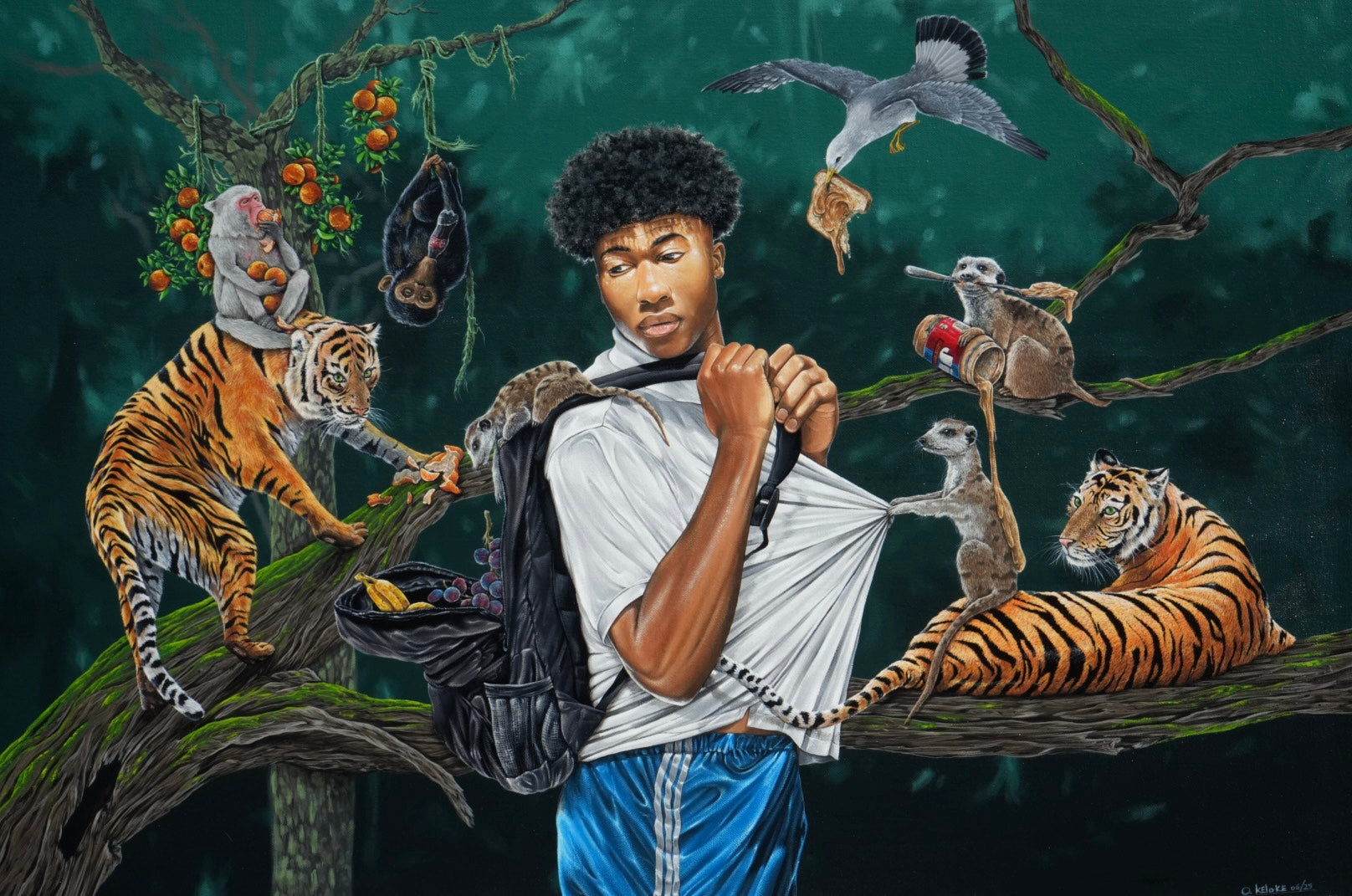 Each animal becomes a symbol of distraction, desire, nostalgia, or instinct, while the vibrant jungle around them blooms with abundance and absurdity. The oranges drip like lost time, the Coca-Cola bottle swings like a relic of simpler days, and the backpack overflows with both survival and sweetness.