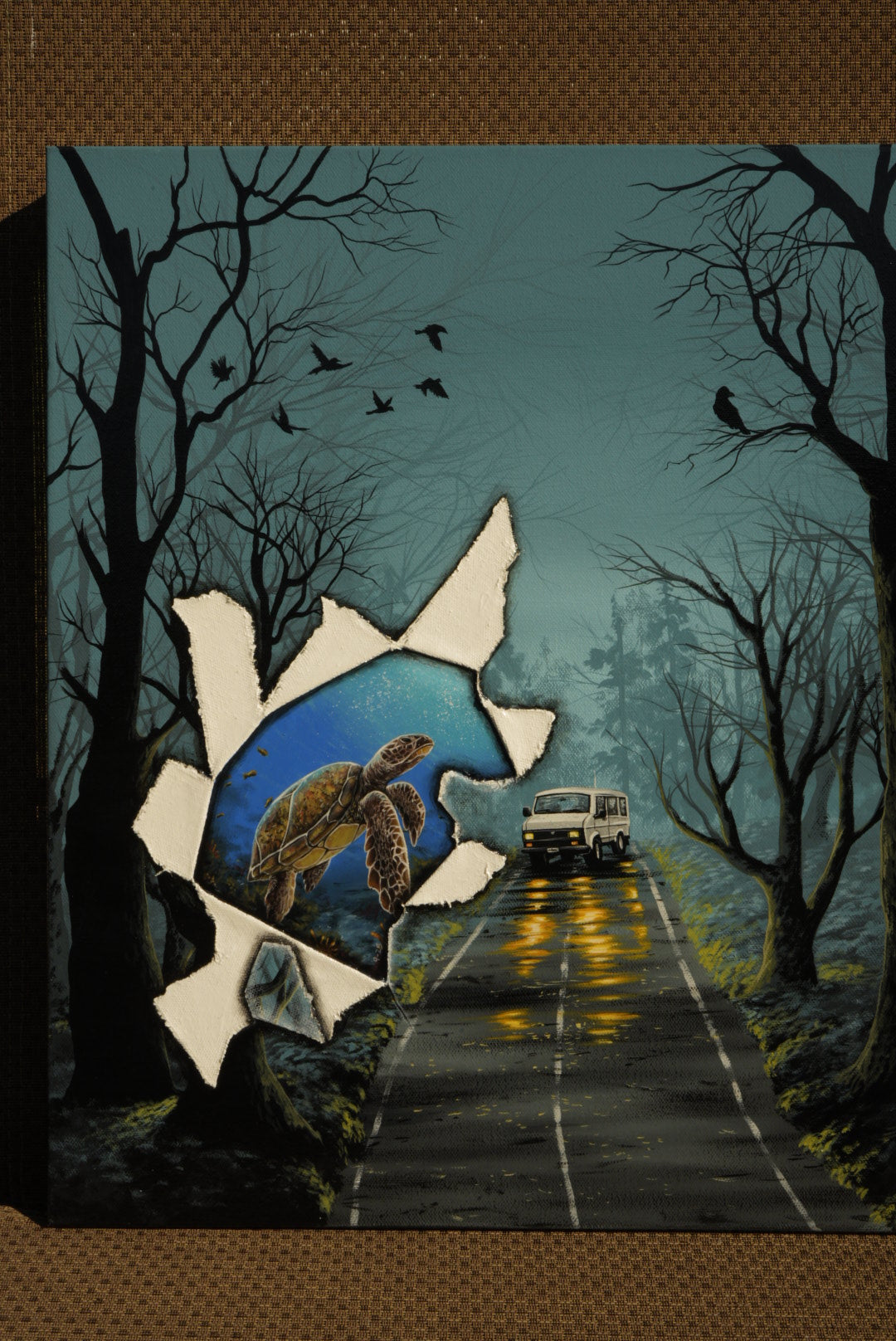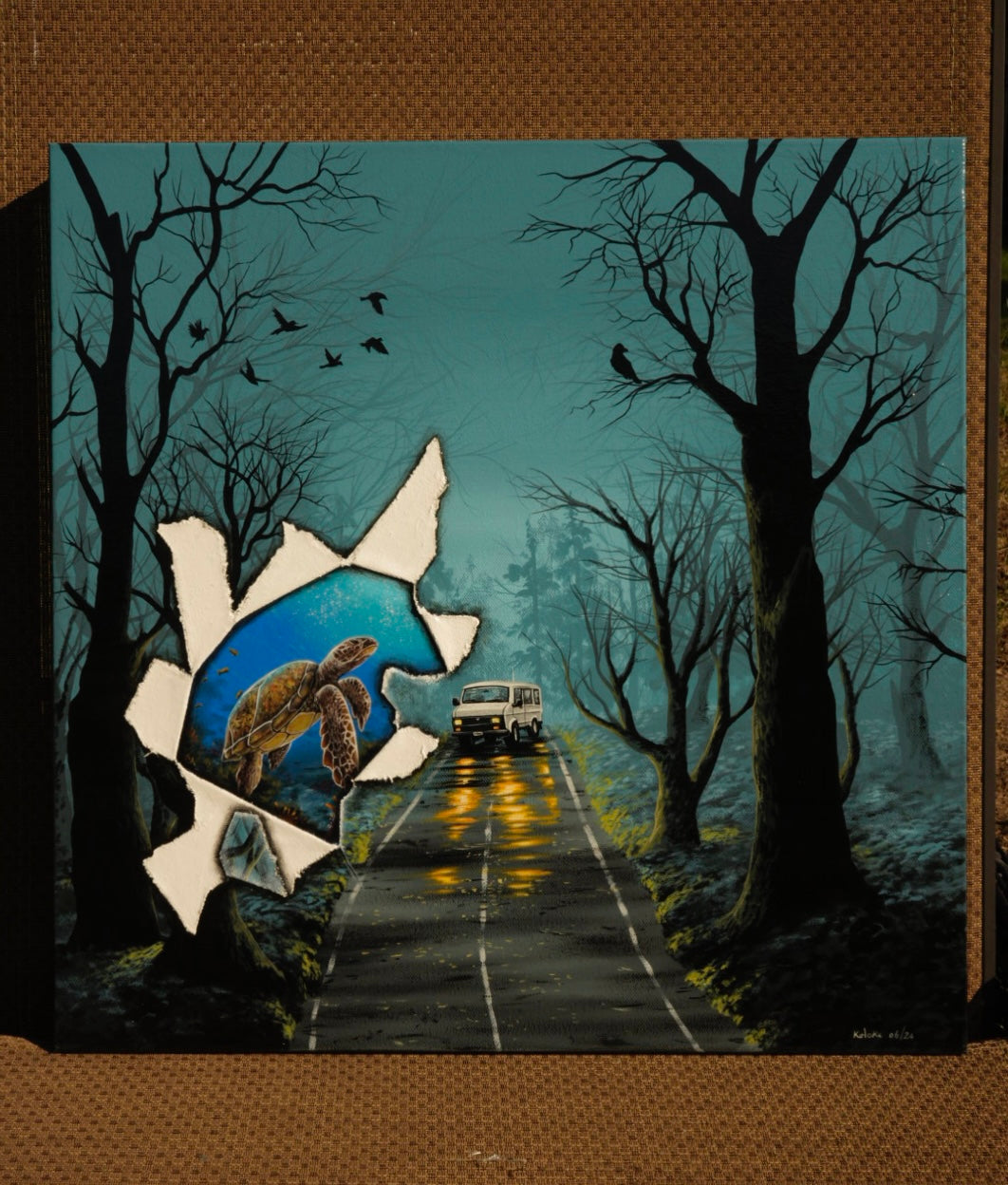 This painting is a reflection of rising above what once felt impossible to escape. The turtle breaking through the wall represents resilience, a quiet strength that refuses to drown, no matter how deep the darkness gets. The misty road beyond stands for life’s uncertain path, where light still finds a way to shine through even in the most haunting moments.
