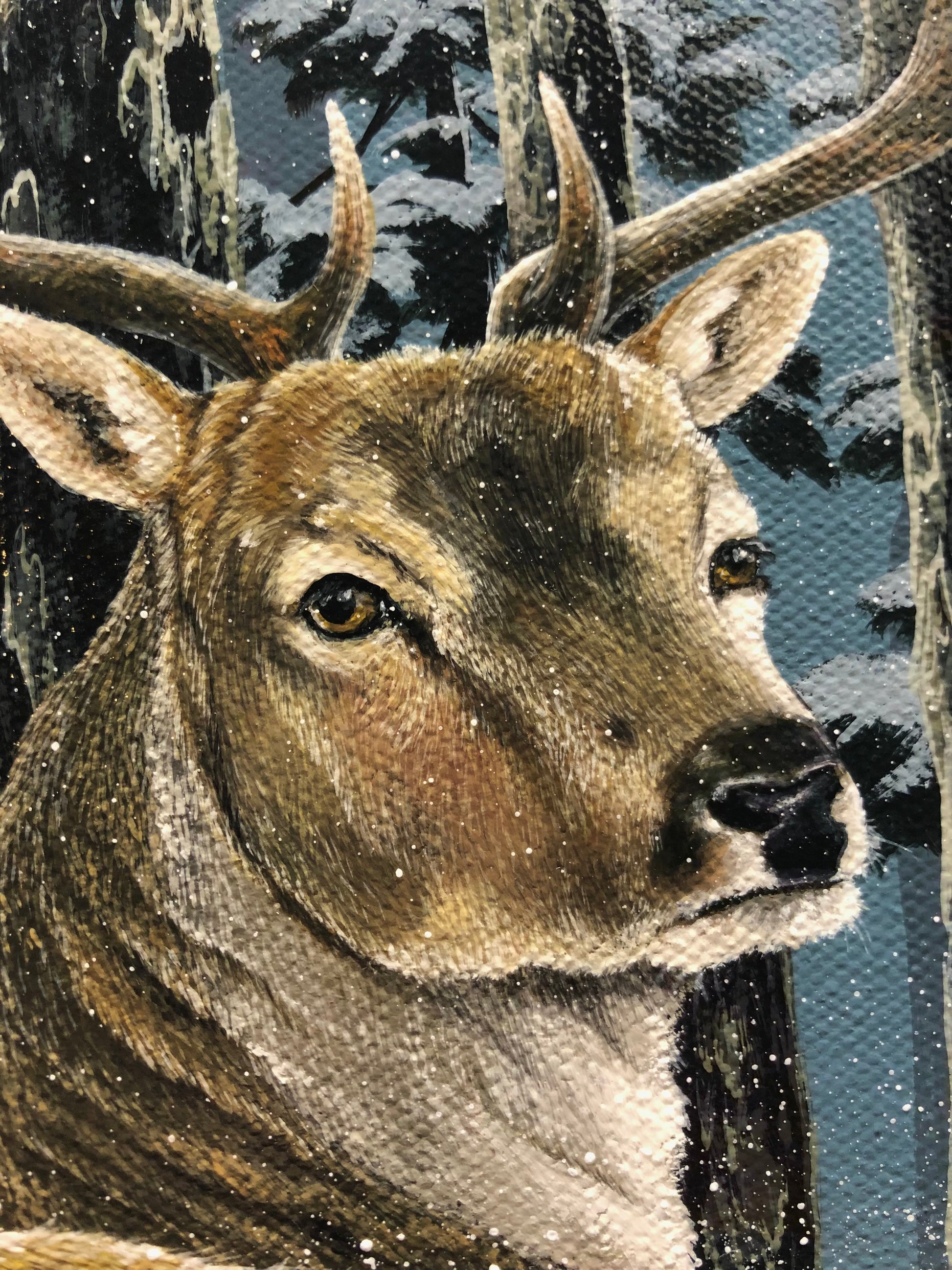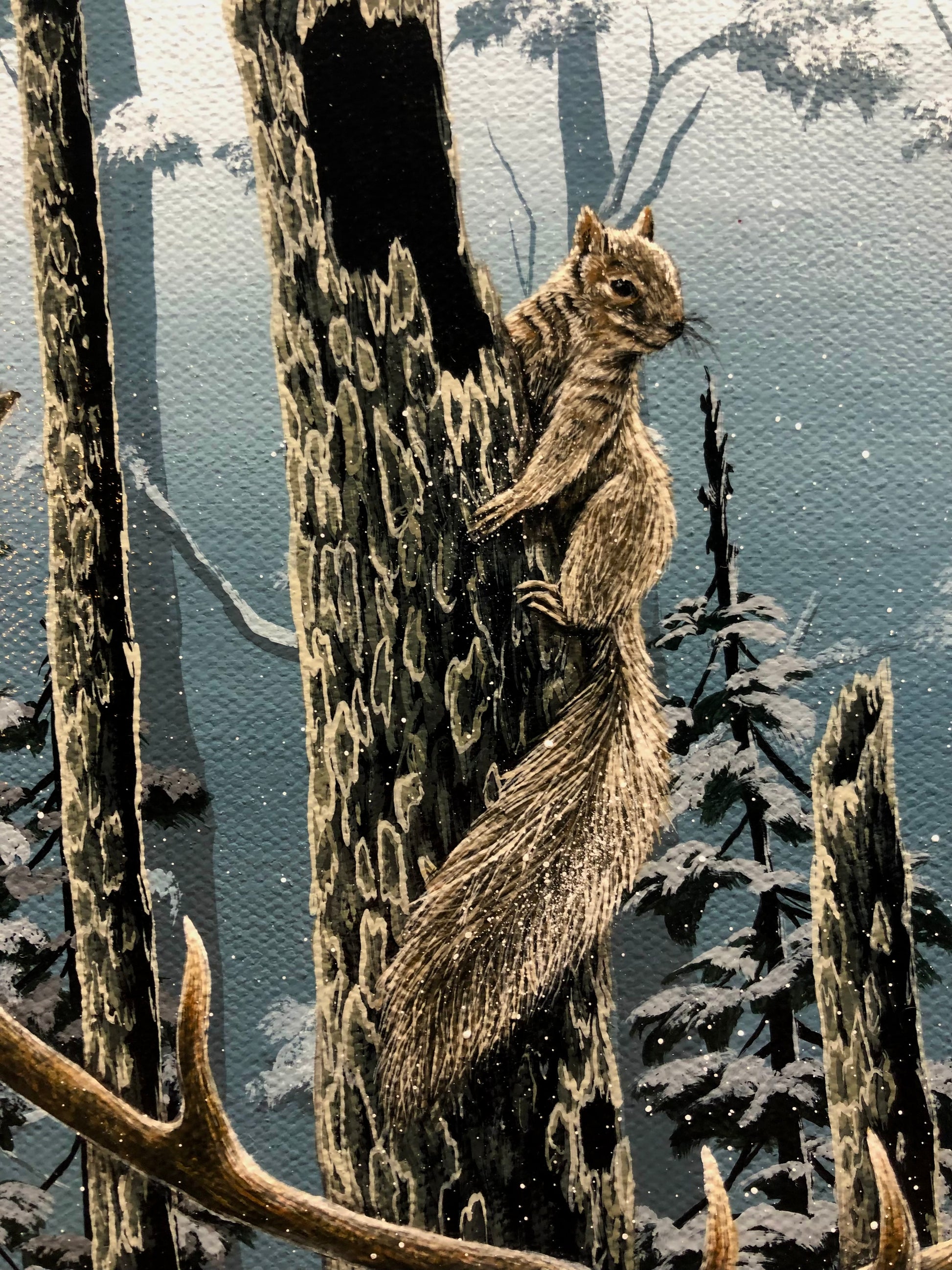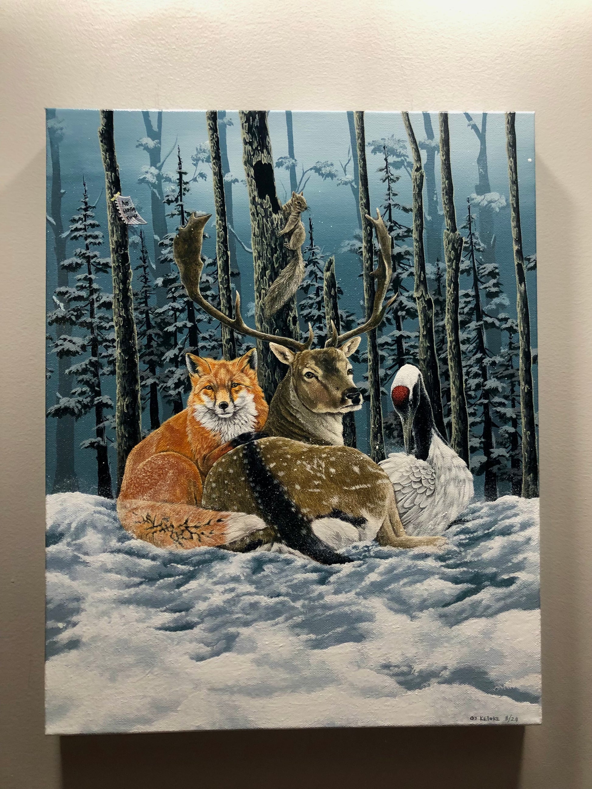 A serene winter forest scene featuring a fox, a deer, and a crane resting peacefully together in a snowy landscape. The background is composed of tall, dark trees with hints of frost, and a squirrel perched on a tree adds a playful touch. The painting evokes harmony and a sense of unity among the animals in their natural habitat, blending intricate details with a calm, snowy ambiance.